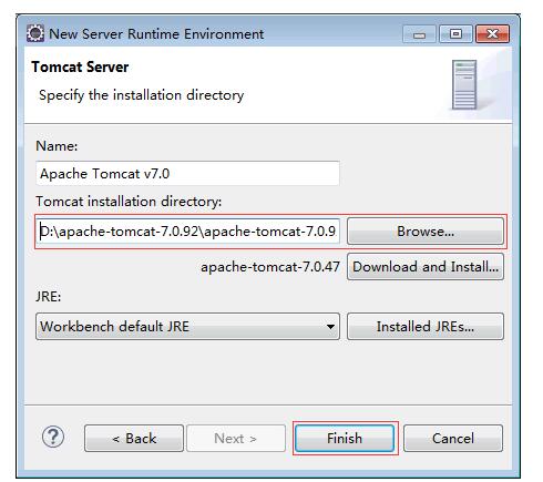 (6) 選擇 Tomcat 的安裝路徑,如圖 10 所示,單擊 Finish 按鈕,完成 Eclipse 的綁定配置。